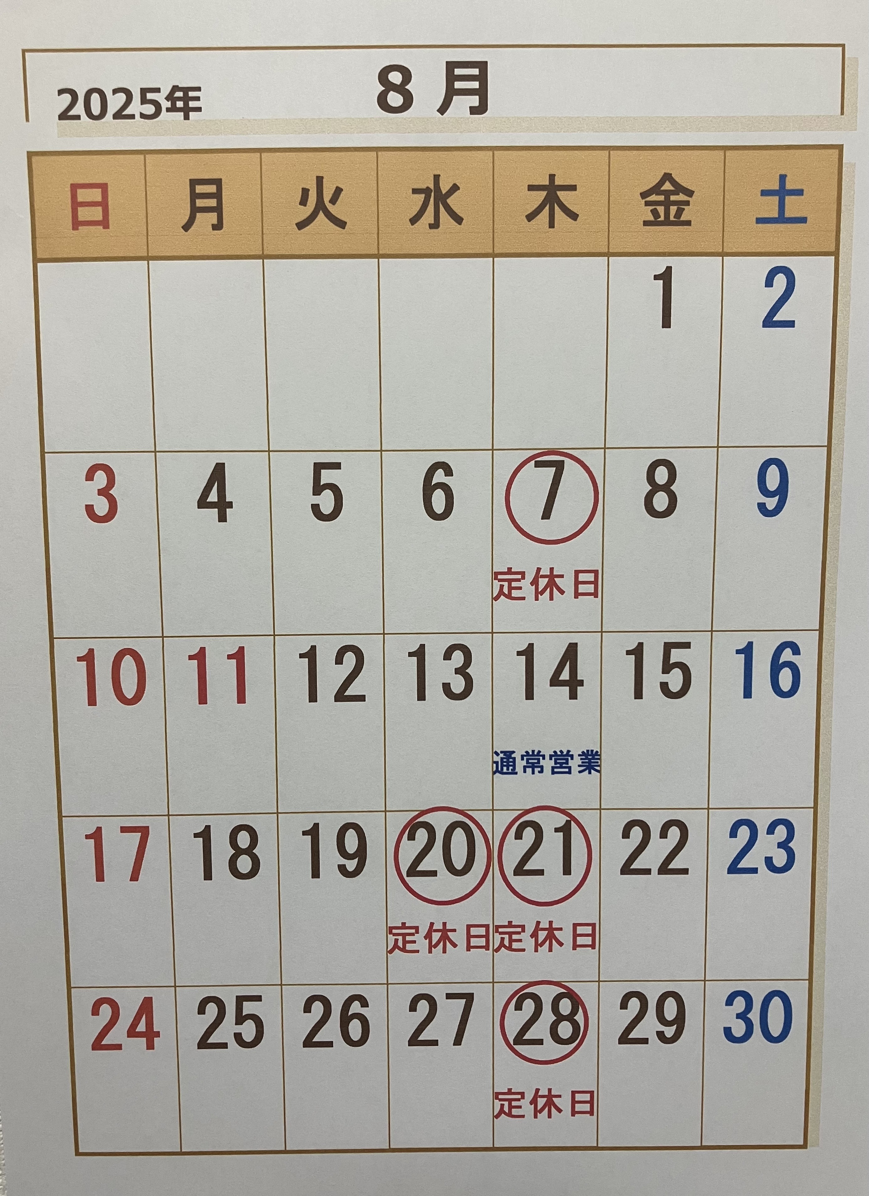 8月 定休日